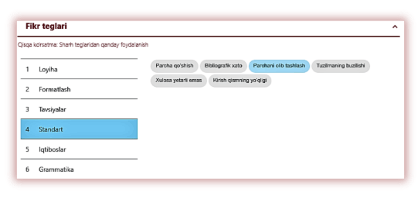 Kommentariyalarni qo'shish jarayoni juda oddiy, bunda talaba o'xshashlik hisobotida qo'shilgan kommentariyalarni real vaqt rejimida ro'yxat shaklida ko'radi.