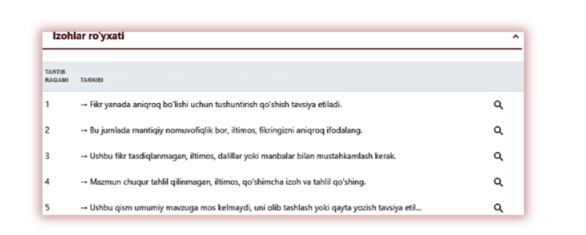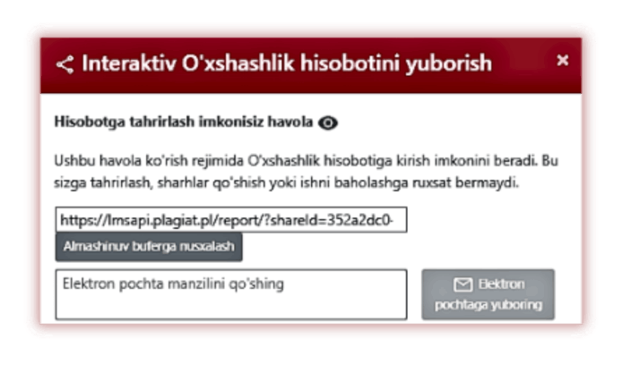 Lupa ikonchasiga bosish bilan, tizim qiziqtirayotgan izohni o‘xshashlik hisobotida aks ettiradi.