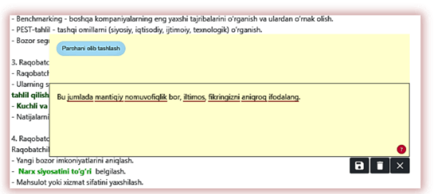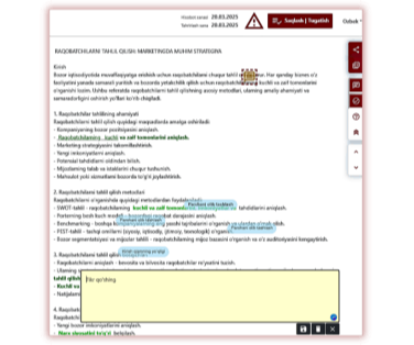Hozirgi ta'lim modeli talabalardan olinadigan fikr-mulohazalarga asoslanadi. Ammo ko‘pincha o‘qituvchilar va ekspertlar ishlarning mazmunini tahlil qilish uchun yetarli vaqt yetishmasligidan shikoyat qilishadi. Shuning uchun biz hisobotning istalgan joyida izoh qoldirish imkoniyatini yaratish bilan birga, o‘qituvchiga matn fragmentining mazmunini manbada topish imkoniyatini beradigan mexanizmni ishlab chiqishga qaror qildik.