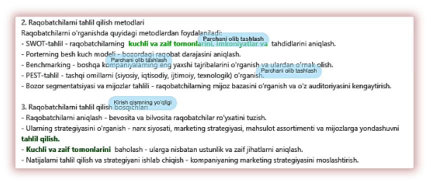 Masalan, biz hisobotda manbalarni aks ettirish uchun faqat bir nechta ranglardan foydalanamiz, izoh qoldirish jarayonini soddalashtirdik, butun manba sahifa shaklida ikkinchi keng oynada aks ettiriladi, bu esa tahlil qilinayotgan matn bilan birga ko‘rinish imkonini beradi va hokazo.