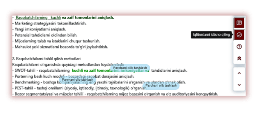 Ushbu funksiya juda qulay bo‘lib, o‘qituvchining fikricha plagiat bo‘la olmaydigan fragmentlarni o‘xshashlik koeffitsiyentidan chiqarib tashlash orqali hujjatlarni tahlil qilishda vaqtni tejash imkonini beradi.