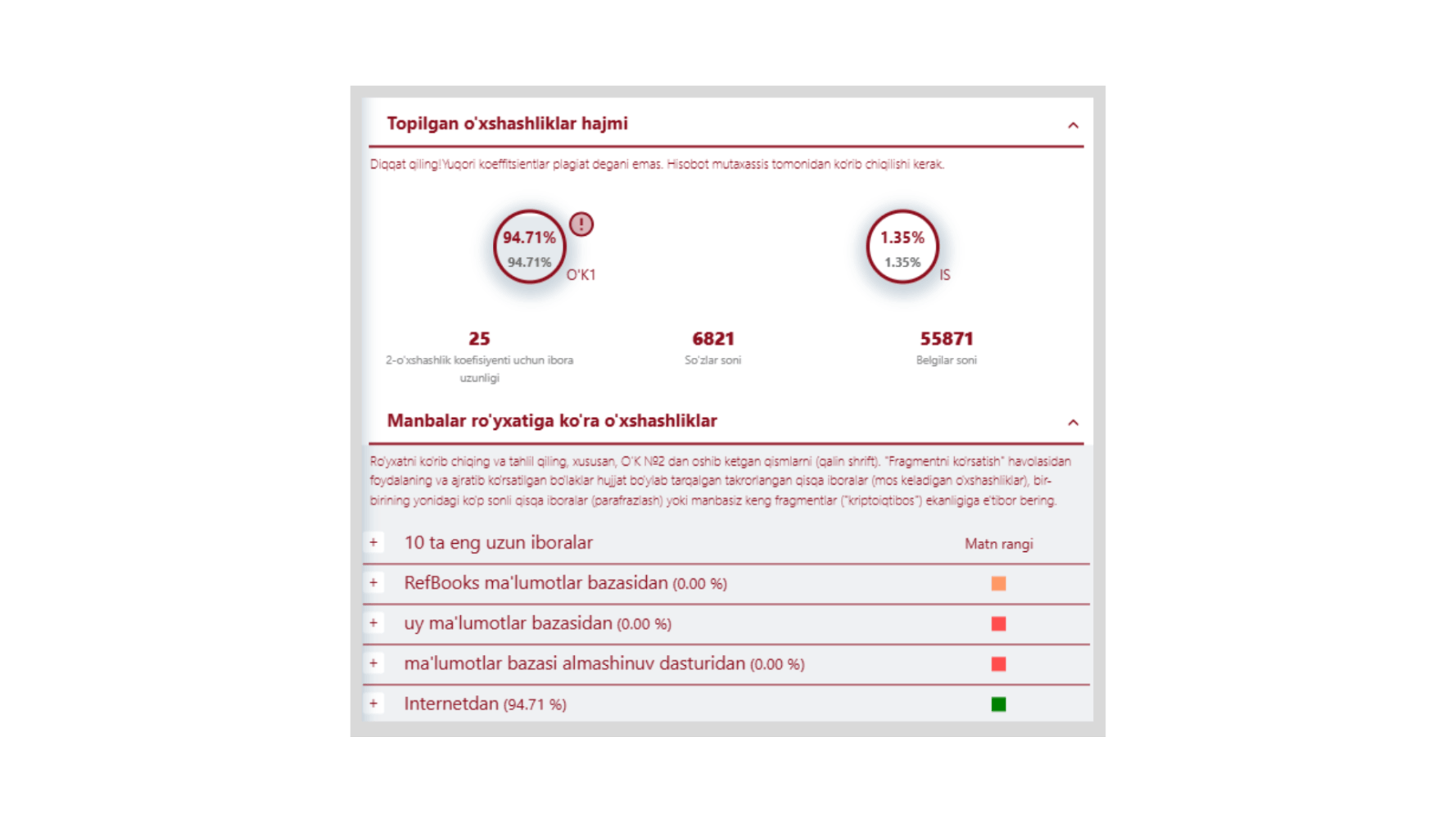 Bizning hisobot qulaylik va tizim modullari bilan ko‘p funksiyali o‘zaro aloqani hisobga olgan holda, "qo‘l ostida" bo‘lgan modullar bilan birgalikda ishlab chiqilgan. Masalan, hisobot o‘z-o‘ziga iqtibos deb hisoblanishi mumkin bo‘lgan fragmentlarni yoki turli sabablar tufayli o‘xshashlik koeffitsiyentidan chiqarilishi kerak bo‘lgan fragmentlarni chiqarib tashlashga, shuningdek, o‘xshashlik yoki noyoblik koeffitsiyentini bir vaqtning o‘zida o‘zgartirishga imkon beradi.