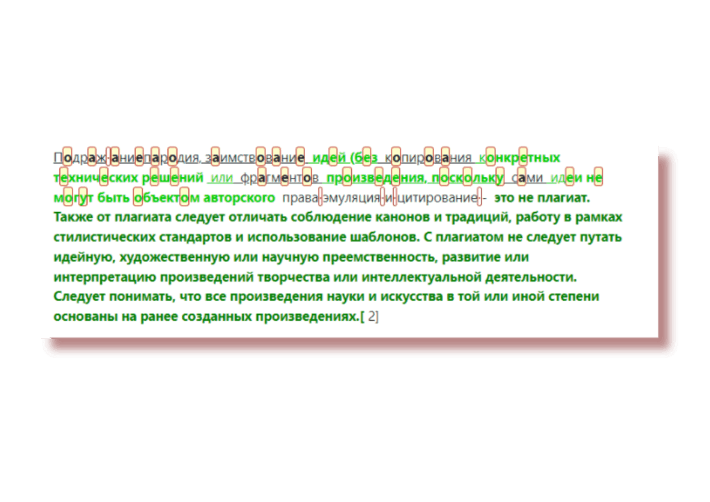 Shriftning oq rangi yoki minimal shrift o‘lchami orqali yashirilgan belgilar soni – ular bo‘shliqlar o‘rniga ishlatiladi, bu esa so‘zlarning birlashishiga olib keladi (hisobotda belgilar rangi ularni to‘g‘ri ko‘rsatish uchun qora rangga o‘zgartirilgan) yoki so‘z/iboralarning buzilishiga sabab bo‘ladi. Bunday iboralar ta’kidlangan. Fragmentlar ustiga sichqoncha kursorini olib borganda, asl fragment o‘zgartirilmagan holda paydo bo‘ladi.