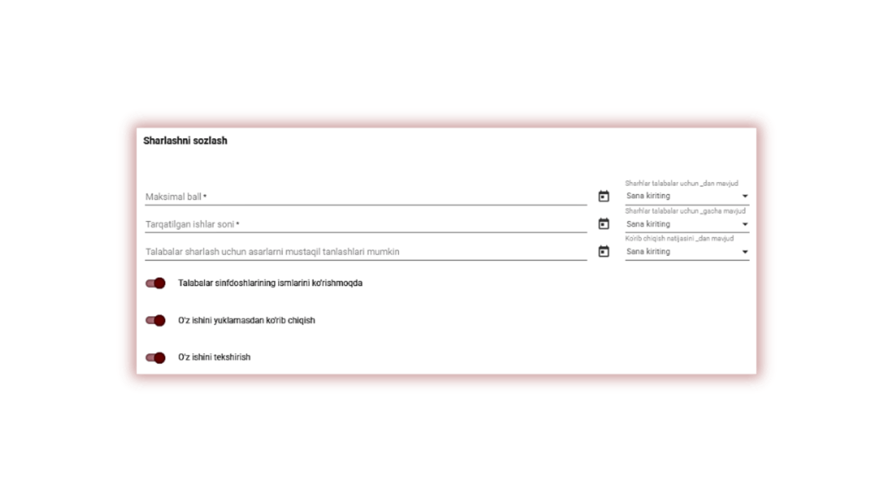 Vazifa funksiyasi talabalar ishlarini plagiatga tekshirish jarayonini tashkil qilish va talabalarga beriladigan fikr-mulohazalar sifatini yangi darajaga ko‘tarish imkonini beradi.