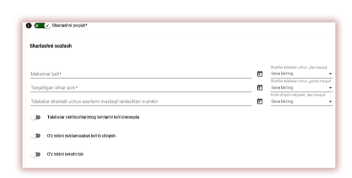 Baholash o‘qituvchi tomonidan vazifa yaratish jarayonida kiritilgan savollar asosida amalga oshiriladi.