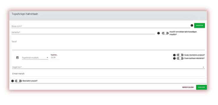 Endi “Vazifa” bo‘limiga yuklangan barcha ishlar AI orqali yaratilganlik va grammatik xatolar bo‘yicha tekshiriladi. Bu esa katta hajmdagi ishlarni tahlil qilish jarayonini sezilarli darajada osonlashtiradi.